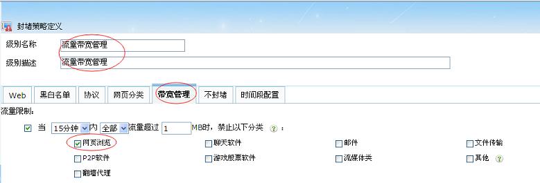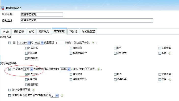1. 如何对流量限制?流量限制是指当一定时段内的累计流量大小超过限制时,禁止指定的网络活动。 1.1 1.2 配置封堵级别,填写“级别名称”和“级别描述”,勾选“流量限制”,配置在某个时间段内允许的最大流量,如果超过这个流量,将禁止指定协议,点击“保存配置”。 ![]() 图2 1.3 并在监控设备列表里,将该封堵级别应用到具体对象上。 1.4 在封堵的情况下,如果流量超过配置的最大允许,看指定的协议是否被禁止。 ![]() 图3 2. 如何对实时带宽限制?实时带宽限制是指当整个局域网的上网带宽超过限制时,对应用此策略的设备,禁止其指定的网络活动。 2.1 新增一个封堵级别。 2.2 配置封堵级别,填写“级别名称”和“级别描述”,勾选“实时带宽限制”,配置最大允许的带宽,如果超过这个带宽,将禁止哪些协议,点击“保存配置”。 ![]() 图4 2.3 并在监控设备列表里,将该封堵级别应用到具体对象上。 2.4 在封堵的情况下,如果带宽超过配置的最大允许,看指定的协议是否被禁止。 ![]() 图5 |