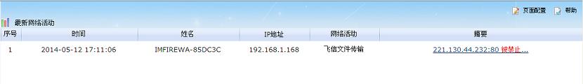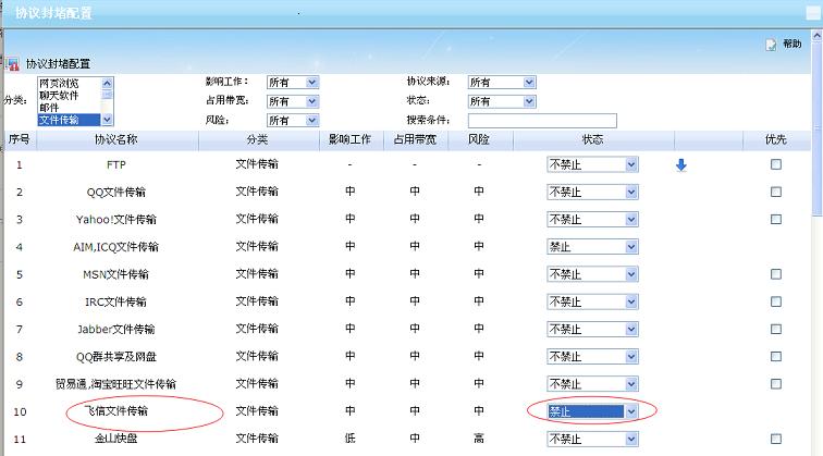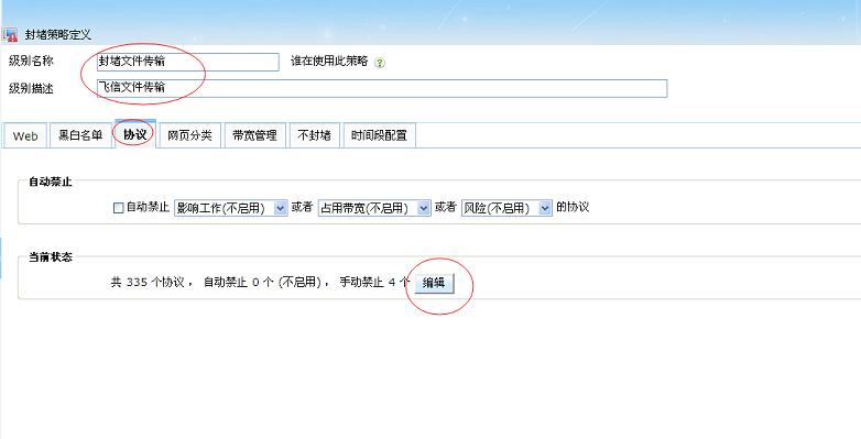 1.1 1.2 配置封堵级别,填写“级别名称”和“级别描述”,然后选择协议,点击编辑,选择“文件传输”分类,将“飞信文件传输”状态选择“禁止”,保存配置。如图所示: ![]() 图2 ![]() 图3 1.3 1.4 在封堵的情况下,如果飞信已经登陆,需要重新登陆,然后发送文件,应该不能被发送,封堵效果如图所示: ![]() 图5 2. 启用文件下载黑白名单可以限制通过网页方式下载的文件类型,文件类型下载支持:扩展名和ContentType。