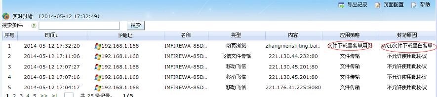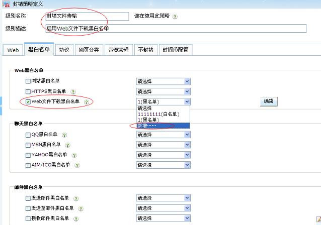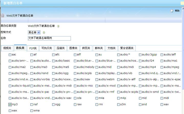 2.1 2.2 配置封堵级别,填写“级别名称”和“级别描述”,然后将“启用文件下载黑白名单”项打上够勾,并选择“新增”。如图所示: ![]() 图7 2.3 在弹出的新增黑白页面里,配置文件下载黑白名单,以黑名单为例,并点击“保存配置”。如图所示: ![]() 图8 2.4 此时,页面又回到了封堵级别里,点击“保存配置”。 2.5 2.6 在封堵的情况下,下载一个格式为MP3的音乐文件(如果您使用下载工具下载,如迅雷,还需要在P2P里把下载工具也禁止,才能完全禁止。),封堵效果如图所示: ![]() 图10 |